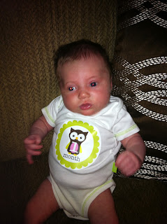 You had a hard couple of weeks where you cried a lot. We called the doctor and they gave you some medicine for reflux. You have been taking it for a couple days and seem to be feeling better. You are a great sleeper at night time but you aren't the biggest fan of day time naps. You like to be held all the time, we are working on a little independence but you are not really interested in that right now. You love it when your Aunt Morgan comes to visit because she has the "magic touch". Whenever she picks you up you stop crying. Yesterday was your Aunt Heather's nurse anesthesia graduation and you were an angel. You even went to dinner afterwards and got lots of compliments for your preciousness, good behavior and even your name. You also got a visit from mommy and daddy's friend Amy who made and brought your birth announcements! We can't wait to get them out to all our friends and family to show you off!!